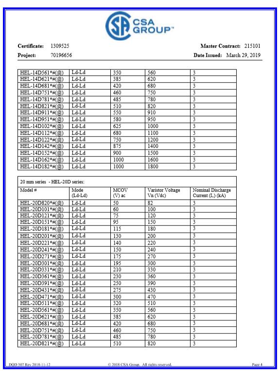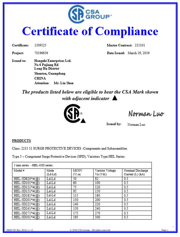 壓敏CQC-14D系列證書