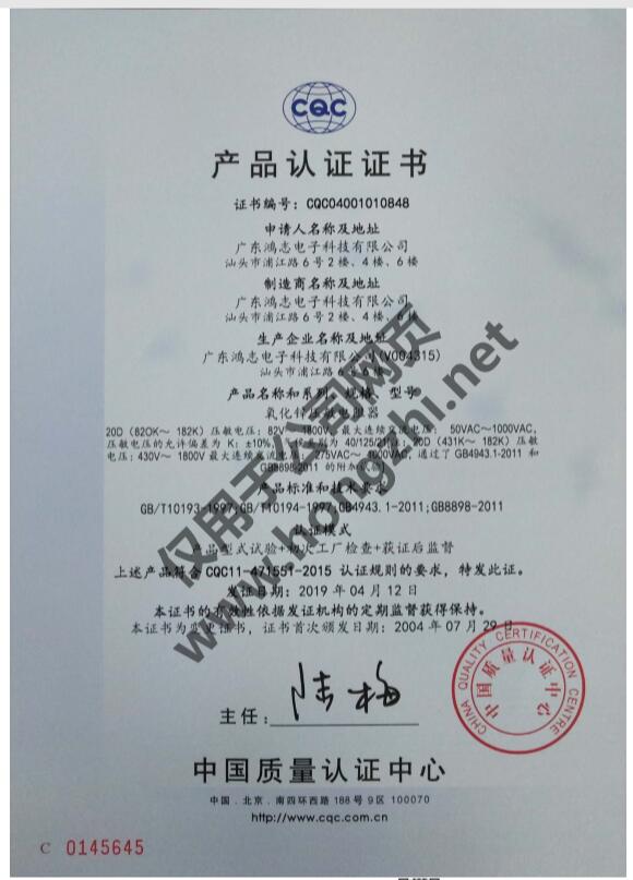 壓敏CQC-20D系列證書
