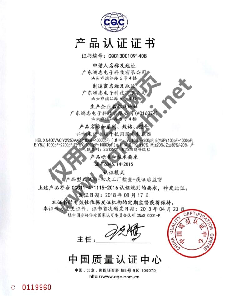 陶瓷電容Y2-CQC證書