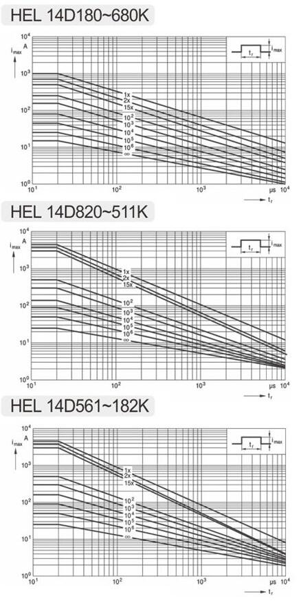 14D滿足20D的 脈沖性能要求 14D instead of 20D 舉例2 Example HEL14D561KX能達到 6KV/3KA 100次 HEL14D561KX reach 6KV/3KA 100 times? |